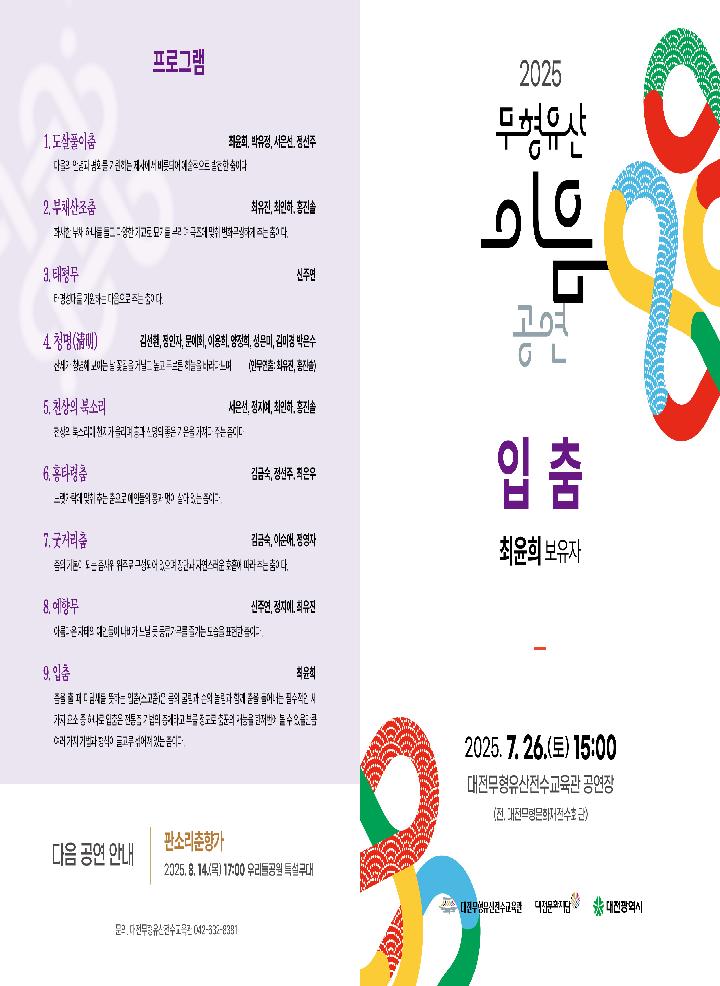 - 공 연: 2025.7.26.(토) 15:00- 장 소: 대전무형유산전수교육관 공연장 - 내 용: 9개 작품(도살풀이춤, 풍화연무, 태명무, 청명, 천상의 북소리, 흥타령춤, 굿거리춤, 예향무, 입춤) - 대 상: 일반 시민 - 관람료: 무료 * 공연 관람을 마친후 관객분 모두 소정의 기념품을 드립니다. ![]() ![]() |