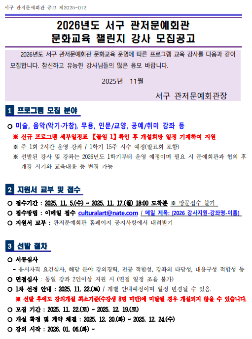 | 2026 관저문예회관 문화강좌 강사 모집 공고 | 2025-11-05 |