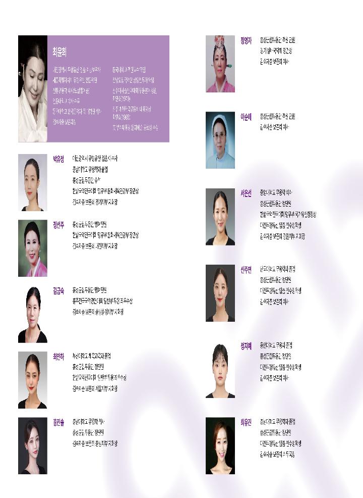 - 공 연: 2025.7.26.(토) 15:00- 장 소: 대전무형유산전수교육관 공연장 - 내 용: 9개 작품(도살풀이춤, 풍화연무, 태명무, 청명, 천상의 북소리, 흥타령춤, 굿거리춤, 예향무, 입춤) - 대 상: 일반 시민 - 관람료: 무료 * 공연 관람을 마친후 관객분 모두 소정의 기념품을 드립니다. ![]() ![]() |